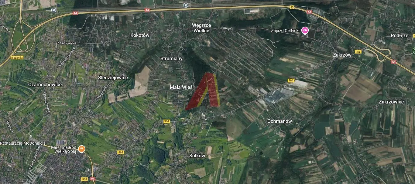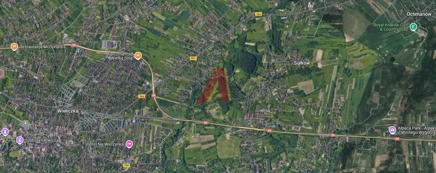 Dobre połączenie z drogą nr 94 , Wieliczką i Krakowem . Działka dla osób ceniących prywatność i spokój . Kształt nieregularny.
